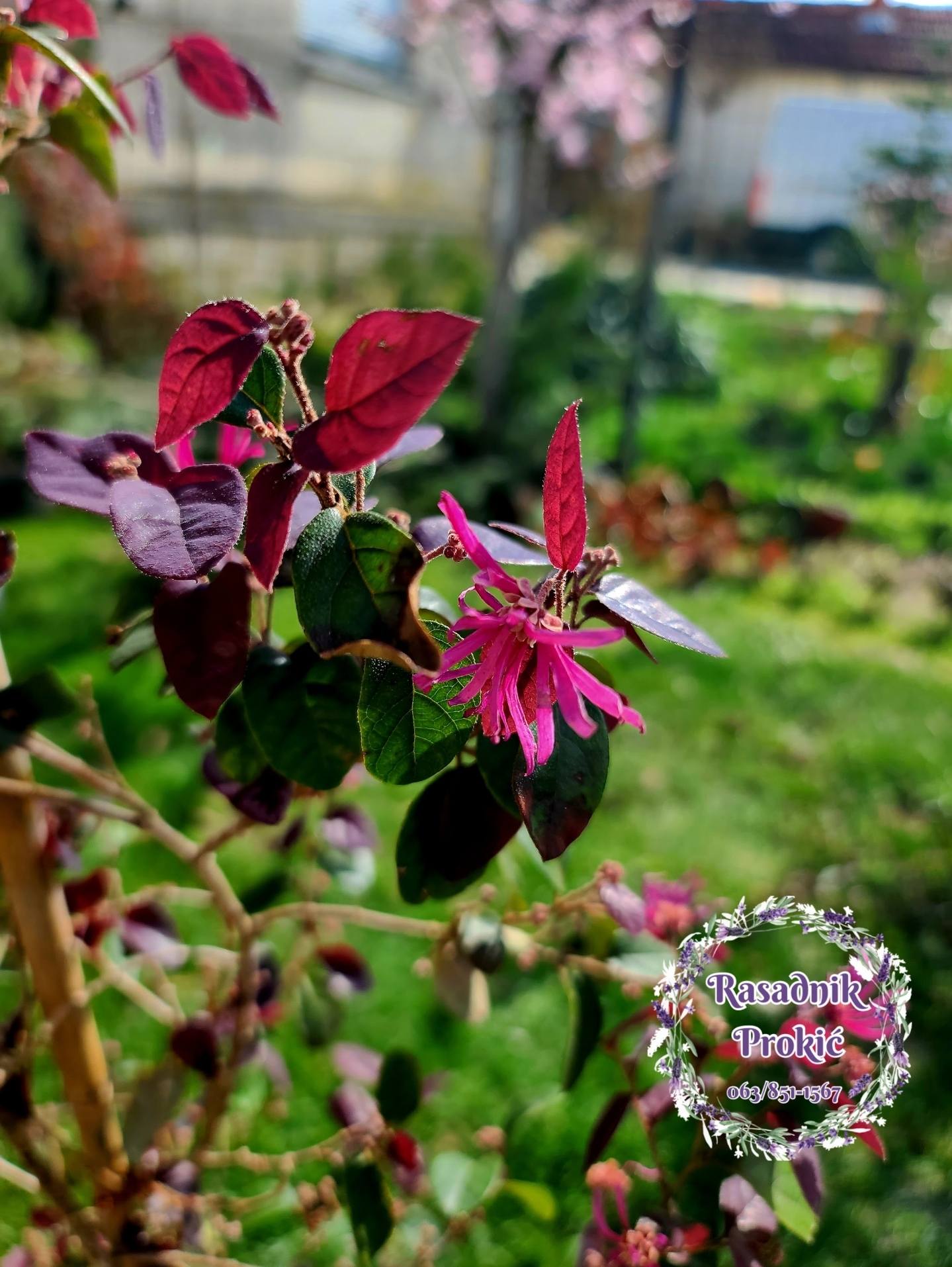**Loropetalum** je dekorativni zimzeleni grm prepoznatljiv po atraktivnim tamnocrvenim listovima i nežnim, resastim cvetovima jarko roze boje. Idealan je za dvorišta, žive ograde i sadnju u saksijama. Lako se održava, voli sunčane i polusenovite položaje i daje poseban egzotičan izgled svakom prostoru.